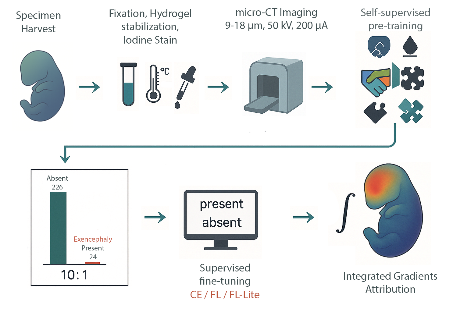 Our approach delivers trustworthy, high‑throughput phenotyping for large mouse genetics programs, triaging defects with near‑perfect sensitivity and reproducible explanations. The recipe generalizes to other malformations and cohorts, offering a practical template for interpretable 3D classification under severe class imbalance.